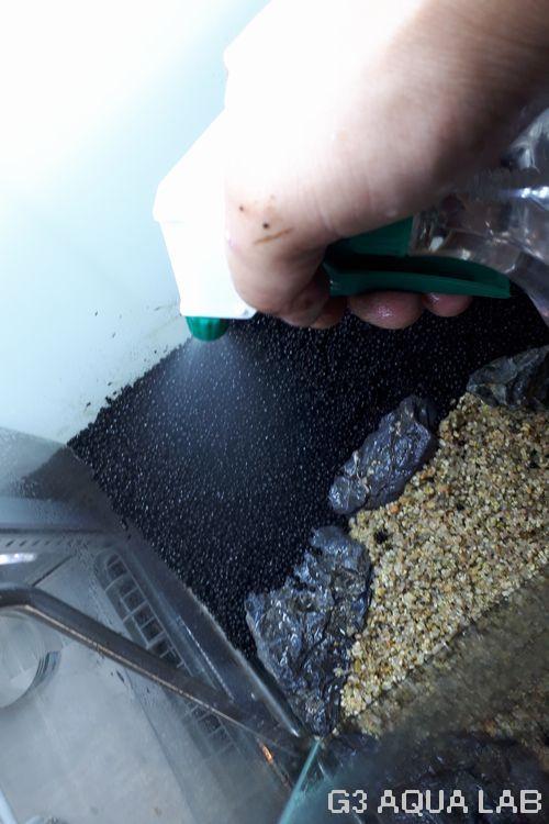いきなり水を入れると、乾いているソイルの粒が、表面張力の力で浮いてしまい、せっかくの分割レイアウトが崩れてしまいます。