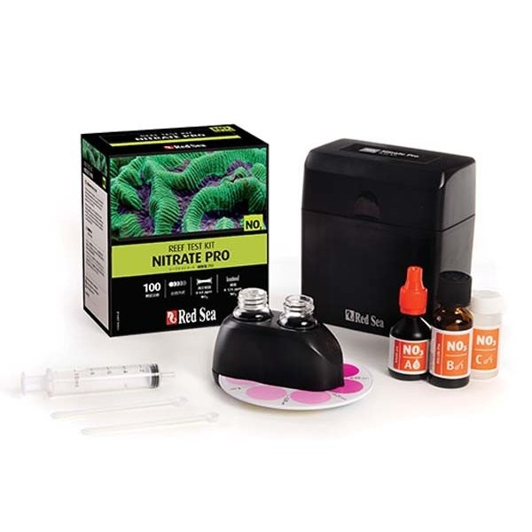 レッドシーの硝酸塩プロ リーフテストキットは飼育水の硝酸塩濃度を0.12ppmの高精度で測定する比色方式の検査試薬です。