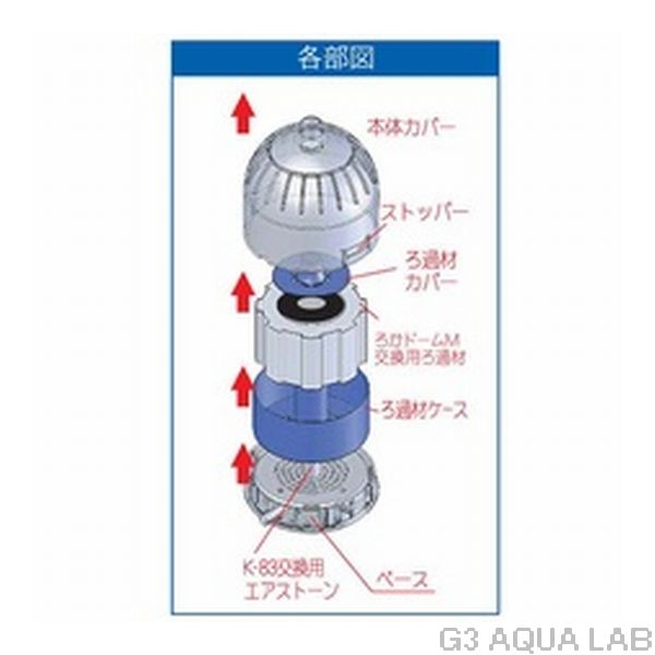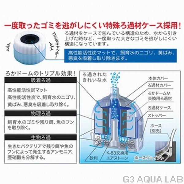 ろかドームは自然界と同じ食物連鎖を水槽内に再現する手助けをし、さらに活性炭やマットでごみや濁り、黄ばみ、悪臭を取り除きます。