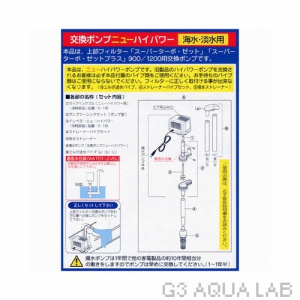 ※本品はニューパワーポンプです。旧製品のハイパワーポンプを交換されるお客様は必ず本品付属のパイプ類をおご使用ください。お手持ちのパイプ類はご使用にならないでください。フィルターに正しく取り付けることができなくなります。(エルボ送水パイプ・ストレーナーセット・吸水ストレーナー)