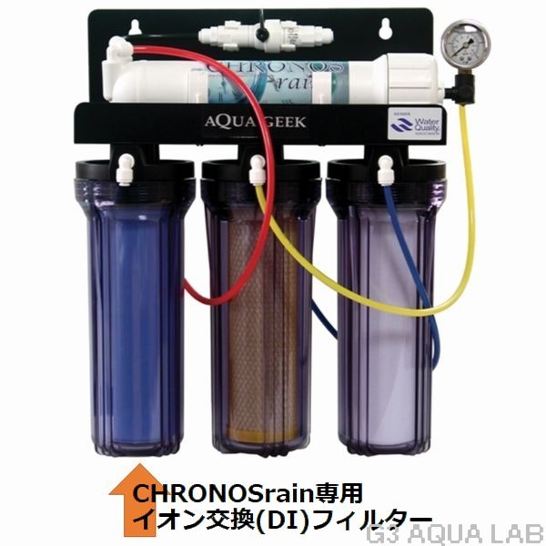 クロノスレインは、5μセディメント、無リン活性炭、逆浸透膜、イオン交換樹脂の4種類のフィルターモジュールで構成されたコンプリートモデルです。水道水に含まれる不純物(サビ、溶存塩素、重金属、コケの栄養素など)を高精度に取り除き、限りなく純水に近い水を生産します。