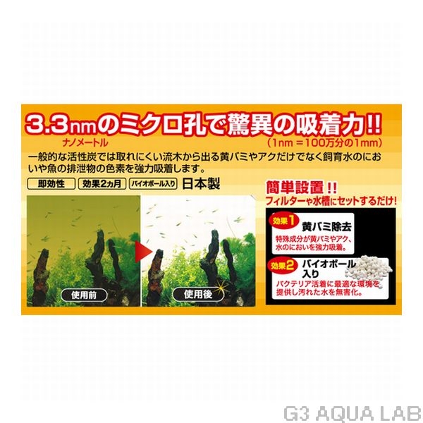 一般的な活性炭では取れにくい流木から出る黄バミやアクだけでなく飼育水のにおいや魚の排泄物の色素を強力吸着します。
