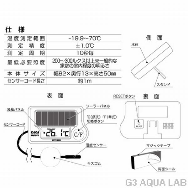 デジタル表示でとっても見やすく、電池不要のソーラーパネル付き、淡水・海水両用水温計です。