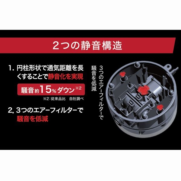 1.円柱形状で通気距離を長くすることで静音化を実現 騒音約20%ダウン