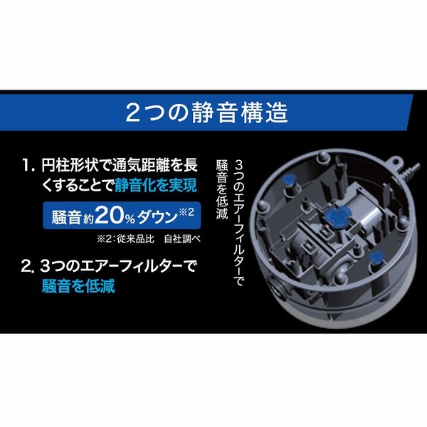 1.円柱形状で通気距離を長くすることで静音化を実現 騒音約20%ダウン