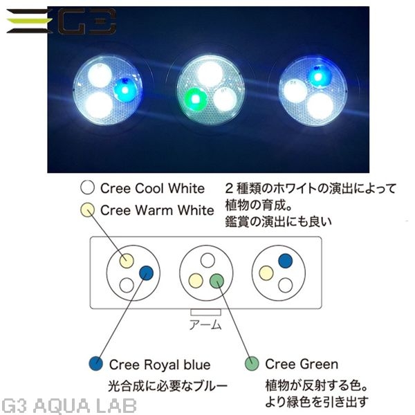 2つのタッチセンサーでブルー・グリーン、ホワイトを10段階に調光出来ます。