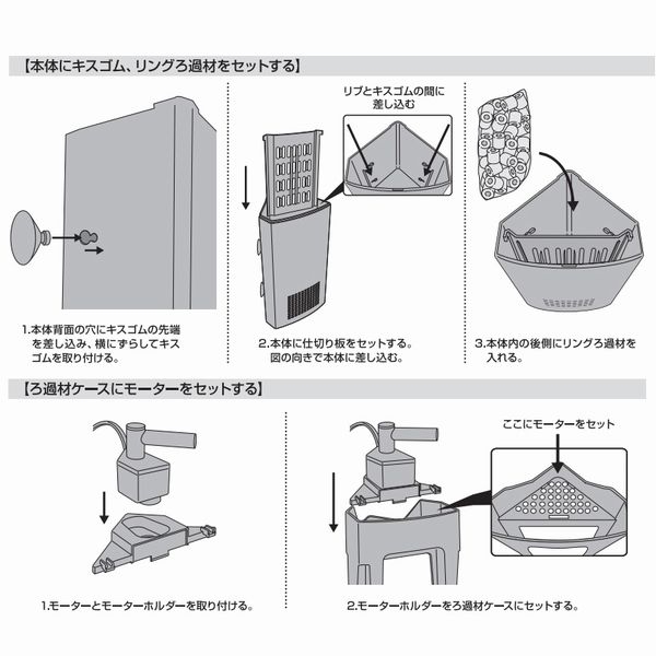 水中設置式なので水槽より高い位置に水を汲み上げる負荷がかからず、モーターの能力を最大限発揮できます。対応水量のUPのために、リングろ過材を標準装備、交換マットもパワーマットLの大型対応を採用。