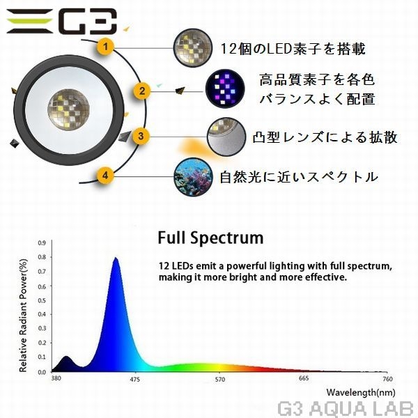 小型化を追求するとLEDの出力が小さくなってしまいますが、AN-30は合計で約30wのLEDが組み込まれています。 特別なレンズは30cm前後の水槽に最適ご使用いただける設計です。