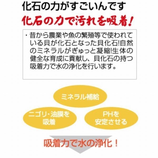 また、貝化石の超微粒子パウダーの持つ吸着力で水のにごりや油膜を吸着し、水の透明度を上げます。