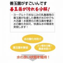 これらの菌が生産する複合酵素の力で有害な悪玉菌を撃退し善玉菌を増殖させ、水の酸化を抑え、魚のフン等を分解、悪臭を抑えます。